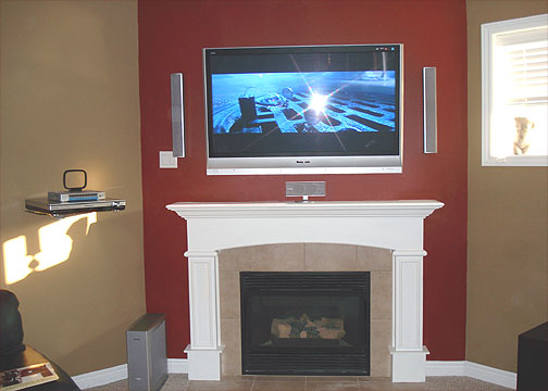 The typical installation of TV panel over a gas fireplace and home theatre in the box with concealed wiring.