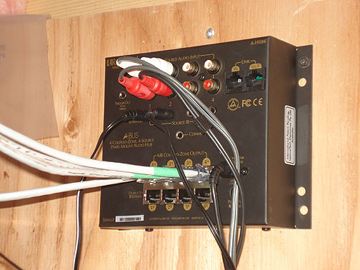 A box is installed in the back room routing signal from the main amp to independent speaker control panels scattered in numerous rooms of the house.
