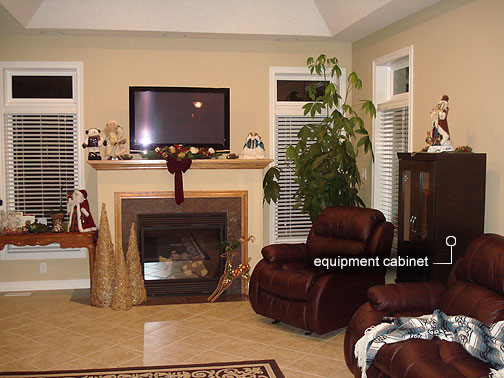 The TV is secure mounted over the fireplace with wires concealed and run to the equipment in a cabinet on the right side of the room.