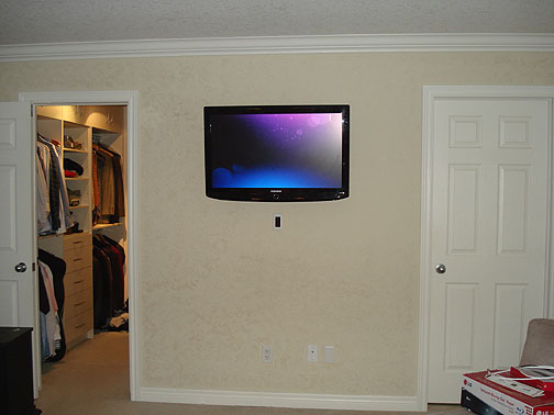 The TV is secure mounted on the bedroom wall with the connected equipment hidden away in a walk-in closet. For convenient and seamless control a special IR eye has been installed on the wall right beneath the TV.