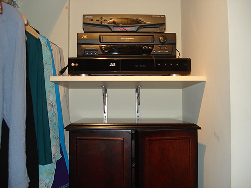 The hidden equipment (cbale box, VCR and Blu-Ray) in the walk-in closet is oufitted with IR transmitters to make control from the bedroom convenient and seamless.